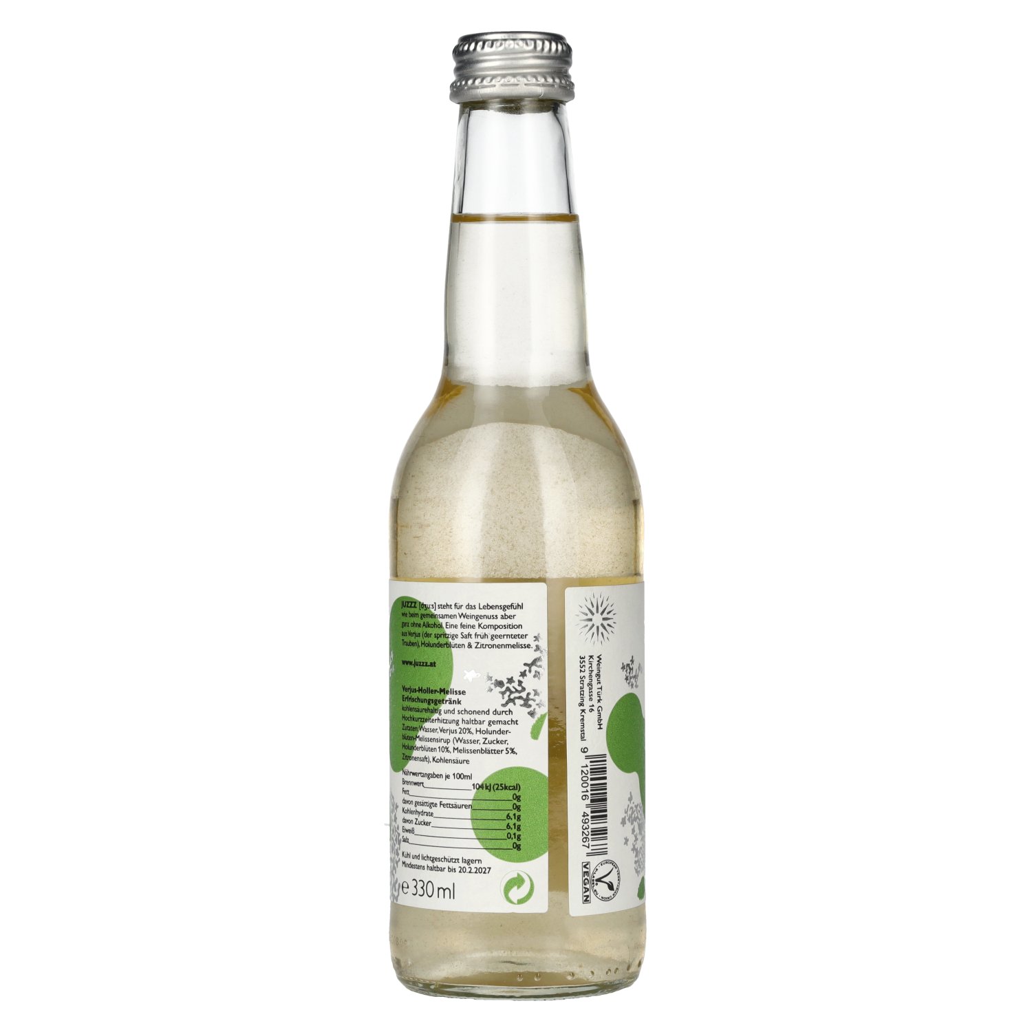 Merk: Ingrediënten:Wasser, Verjus 20%, Holunderblüten-Melissensirup (Wasser, Zucker, Holunderblüten 10%, Melissenblätter 5%, Zitronensaft), Kohlensäure