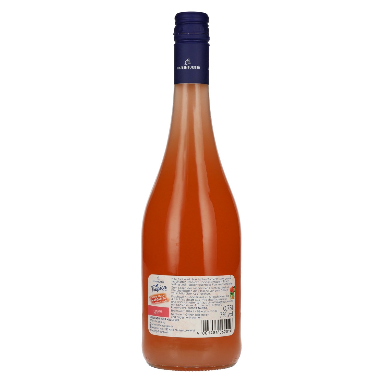 Ingrediënten:Fruchtwein-Cocktail aus 70% Fruchtwein, mit 4,5% Pfirsichsaft aus Pfirsichsaftkonzentrat und 0,5% Limettensaft aus Limettensaftkonzentrat, mit Kohlensäure, Aroma und Farbstoff, konserviert, enthält Sulfite
