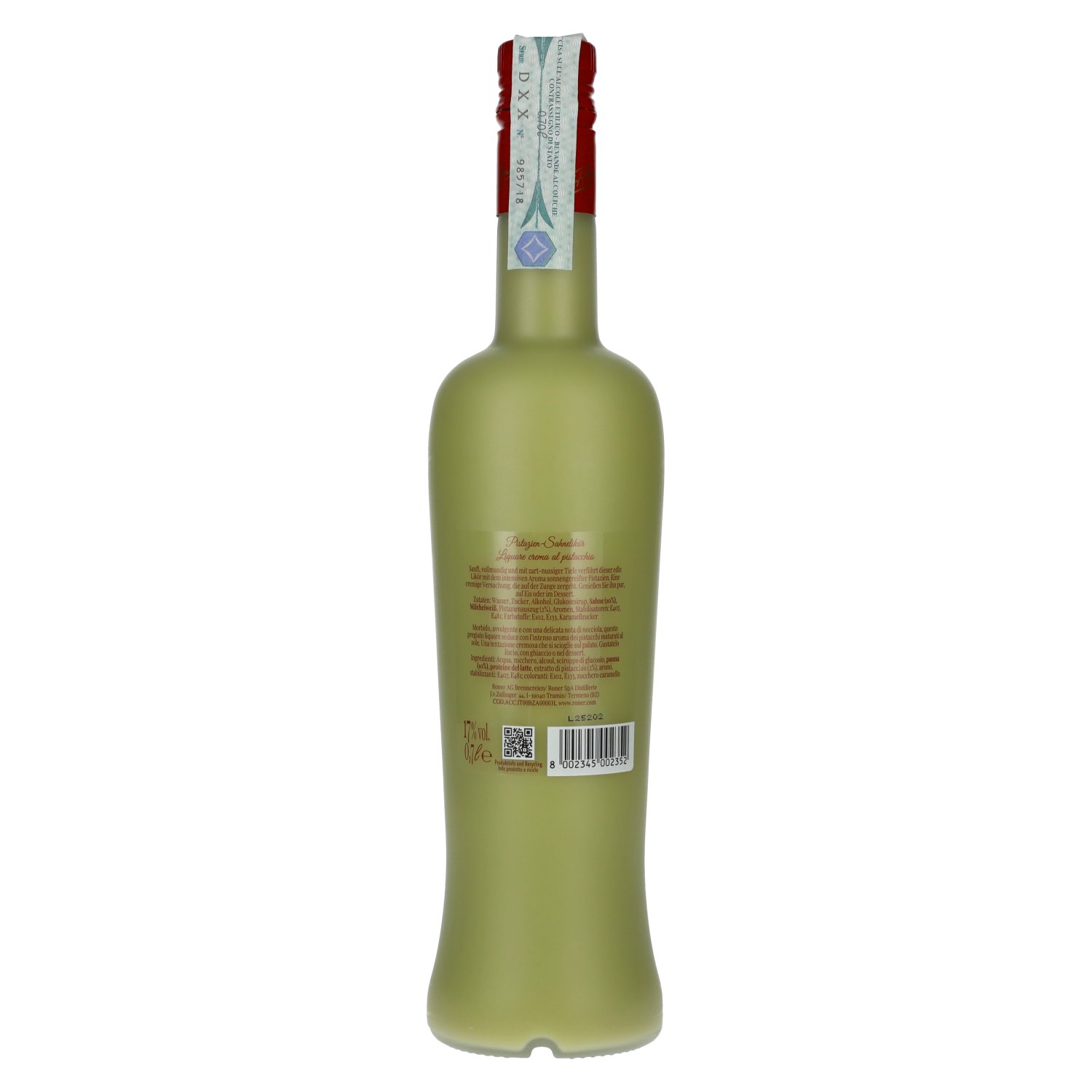 Merk: Ingrediënten:Wasser, Zucker, Alkohol, Glukosesirup, Sahne (10%), Milcheiweiß, Pistazienauszug (2%), Aromen, Stabilisatoren: E407, E481, Farbstoffe: E102, E133, Karamellzucker