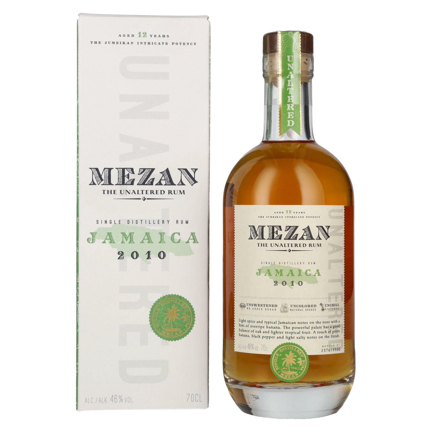Mezan The Unaltered Rum Jamaica 2010 46% Vol. 0.7 l + GB is een authentieke Jamaica rum die op indrukwekkende wijze de puristische stijl van de gerenommeerde Mezan The Unaltered Rum serie weerspiegelt. Het Mezan Rum merk staat voor een beperkte colle Proefnotitie: Kleur: Goudgeel, warme reflecties.