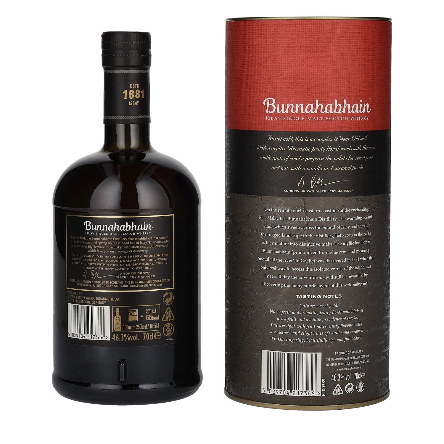 Bunnahabhain Distillery, gelegen aan de schilderachtige kust van het Isle of Islay, werd opgericht in 1881 en staat bekend om zijn unieke, ongepelde whisky's. De distilleerderij was oorspronkelijk afhankelijk van de handel over zee en beleefde een ke Proefnotitie: Kleur: Diep goud.